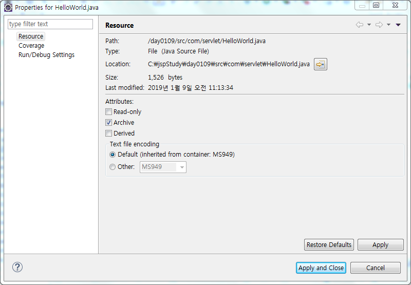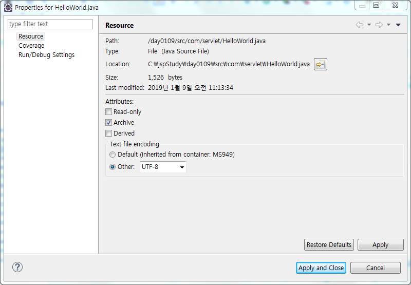 ㅇ Resource에서 encoding을 default가 아닌 Other 클릭 후 "UTF-8"으로 변경