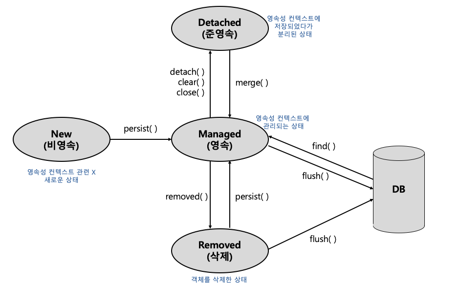 - 영속(managed) : 영속성 컨텍스트에서 관리되는 상태