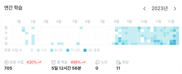 23년 하반기 전에도 개발 관련 책을 읽거나 인강을 듣기는 했지만 매일 공부하는 습관을 들이기 위해서 본격적으로 공부를 했던 한해로 2023년을 회고할 수 있다! 정리하다 보니 진짜 열심히 공부했구나!