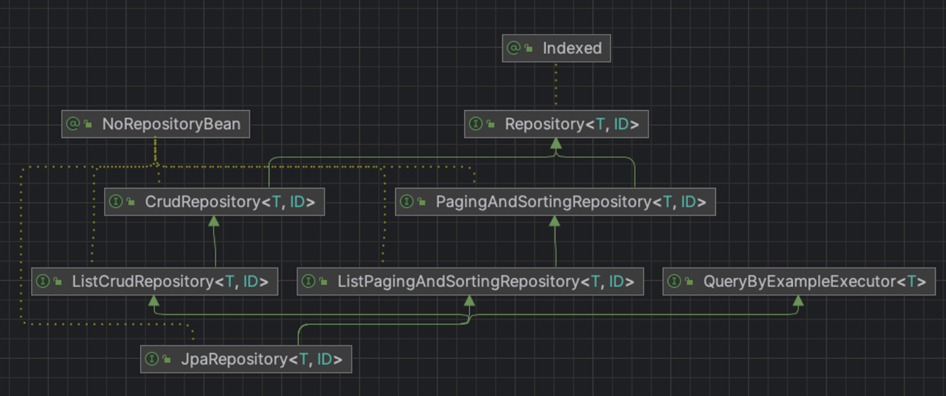 - 위 다이어그램에서 볼 수 있듯이 JpaRepository는 다양한 인터페이스를 상속함