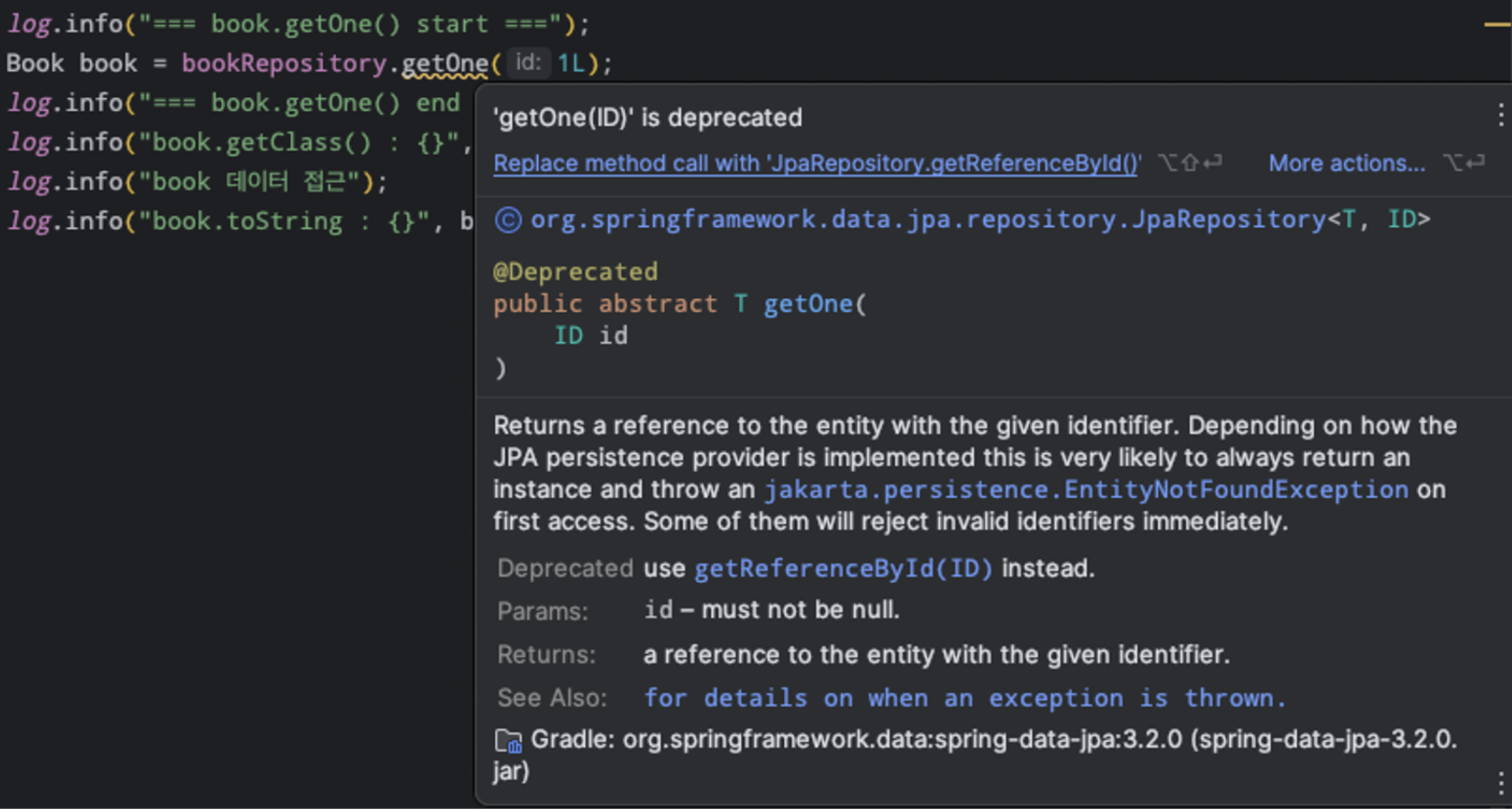 - 이제는 더 이상 사용되지 않고 getReferenceById() 사용하라고 추천해 줌