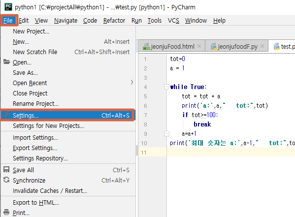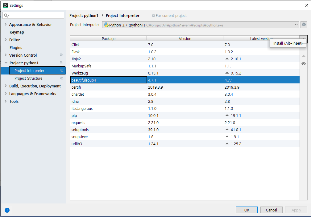 - 설치 : file > settings > Project:bitcameTest >Project Interpreter(설치된 모듈)> +누르면 추가 가능>원하는 모듈 선택 후 > Install Package > successfully 뜨면 끄기