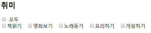 설문을 받거나 회원 가입을 하는 경우 사용자의 정보를 알기 위해서 체크박스를 사용하는 경우가 있다 이런 경우에 사용자 입장에서 모든 것을 선택하고 모든 선택을 해제해야 하는 경우가 있는데 이런 것을 제이쿼리로 구현이 가능하다.